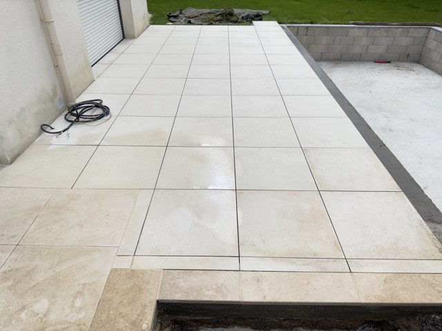 Cas 1. Une terrasse d’environ 22 m² présentait des zones de stagnation après la pluie. L’objectif a été de reprendre le support et de rendre l’écoulement logique, puis de poser un carrelage extérieur adapté, avec des joints réguliers et des seuils propres. Le résultat attendu, c’est une surface nette, plus sûre, et plus simple à nettoyer.